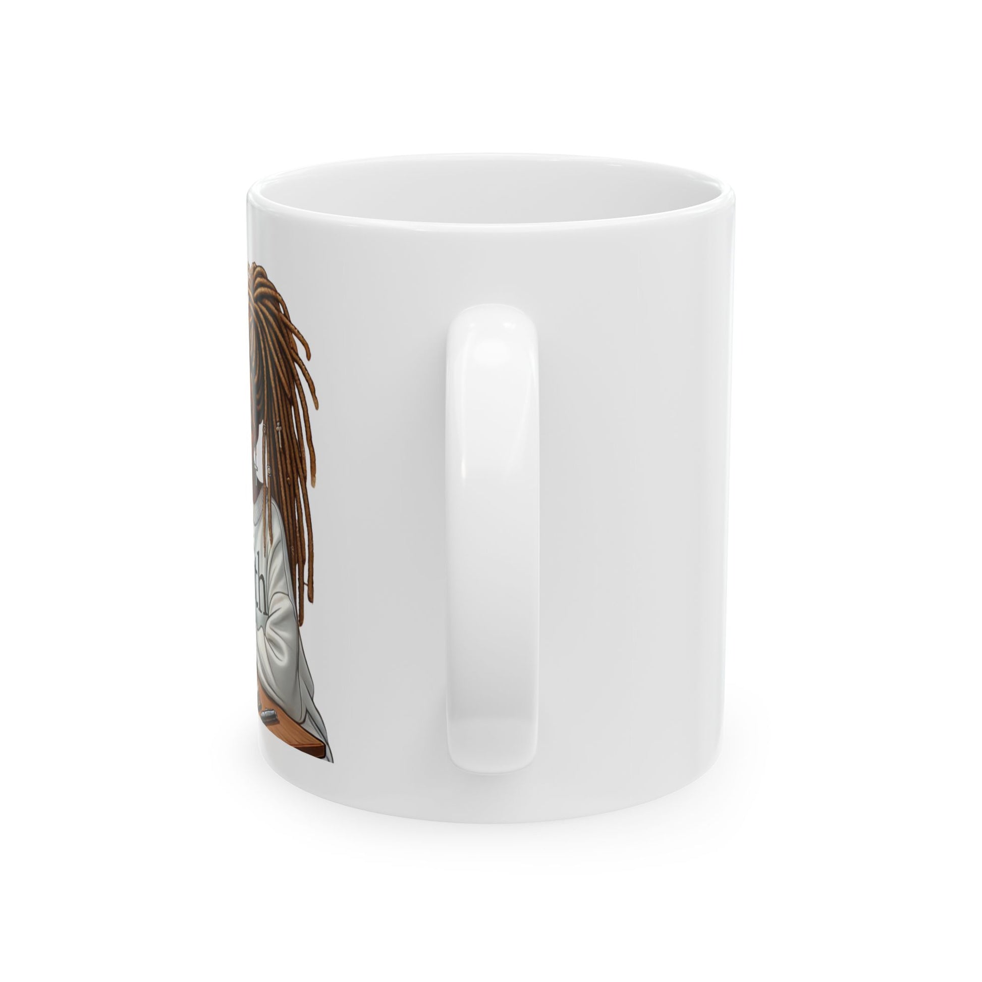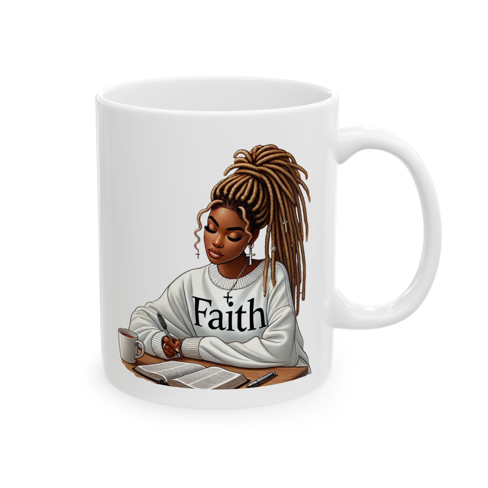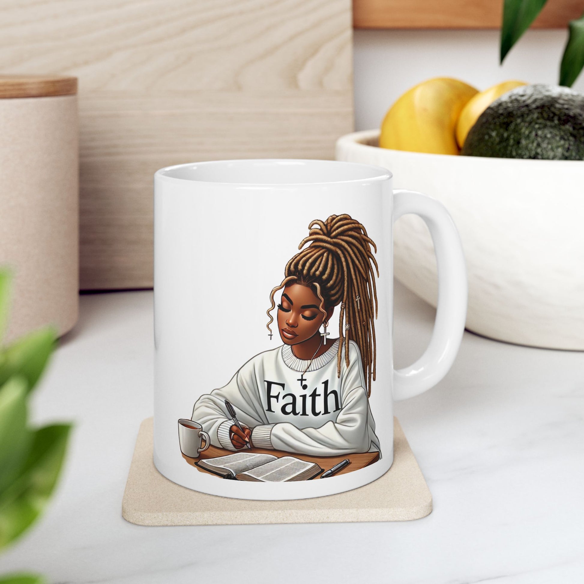 Sip with purpose. The Faith in Flow mug captures a sacred moment of peace—a beautiful woman journaling her prayers, wrapped in quiet devotion and dressed in her “Faith” sweater. Her locs, her glow, and her stillness speak to the divine rhythm of spiritual alignment.