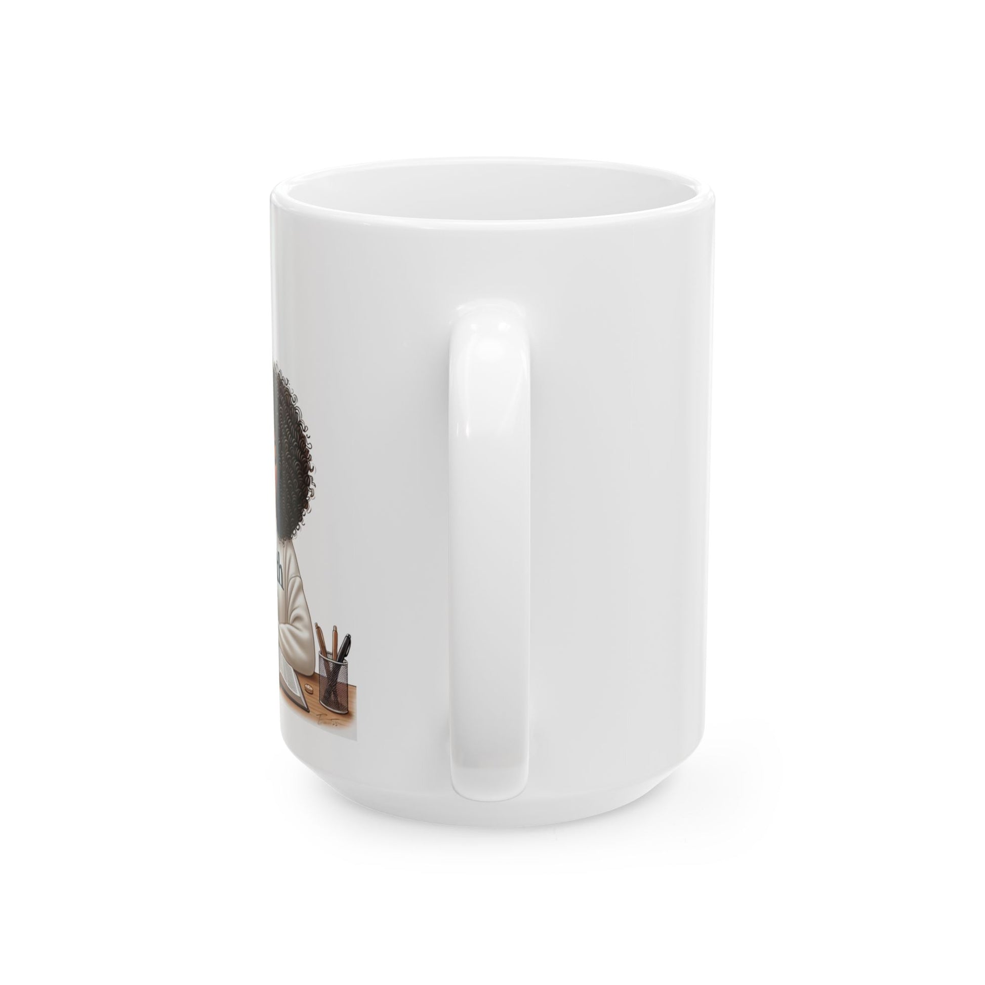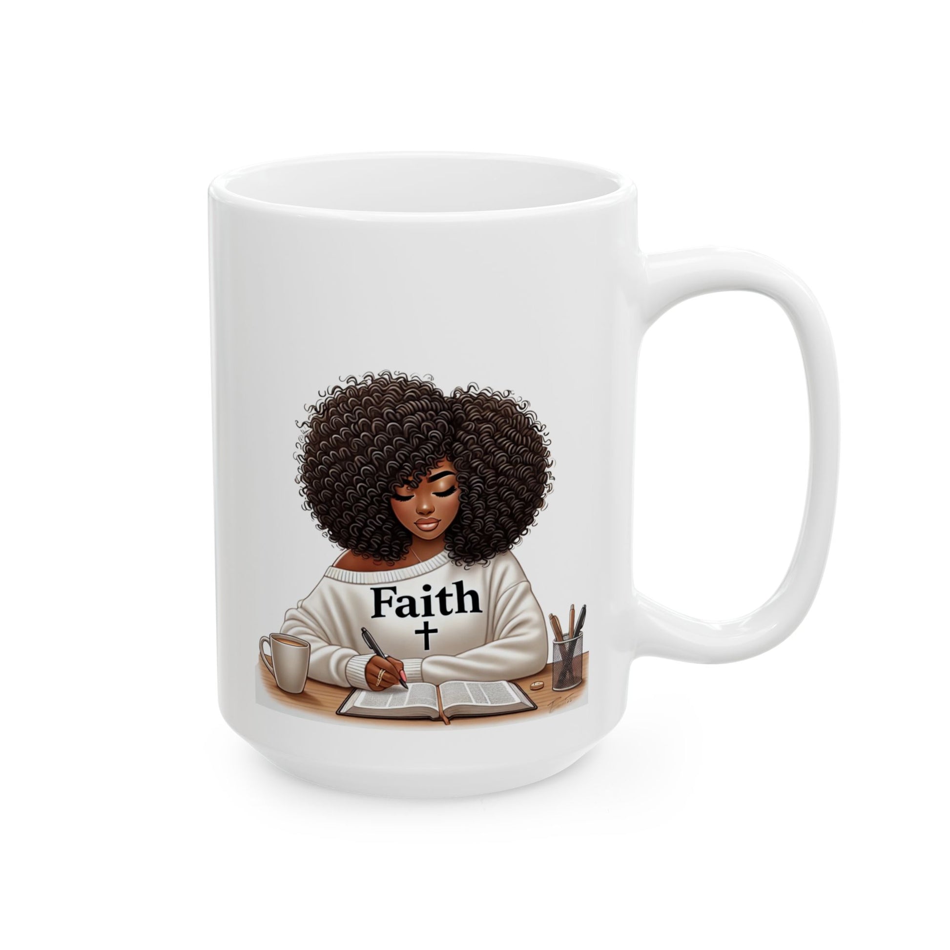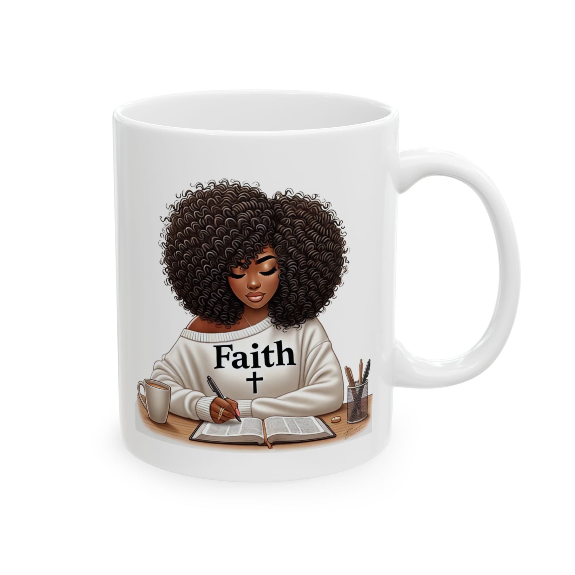 Sip strength. The Faith Unshaken mug captures the quiet power of a woman rooted in God, journaling with intention and grace. Her natural curls, soft expression, and cozy “Faith” sweater radiate a message of unwavering devotion and self-worth.